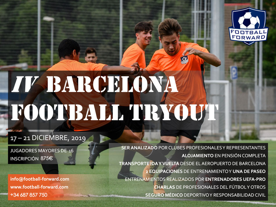 En esta IV edición de los tryouts de fútbol de Barcelona de JEP Sports y Football Forward hay más oportunidades que nunca para los jugadores. Para el ganador de los tryouts, un contrato de representación en exclusiva durante 2 años por la agencia JEP Sports Management firmado, sellado y registrado en la RFEF y la FIFA. Los 2 finalistas, tendrán una prueba asegurada de 15 días con 1 equipo de la 3a división española de fútbol. Los 3 premios directos no excluyen cualquier otra oportunidad para el resto de jugadores no ganadores. Así pues, no lo dudes, reserva ya tu plaza para la IV edición de los tryouts de fútbol de Barcelona que se celebran del 17 al 21 de Diciembre de 2019. Plazas limitadas!