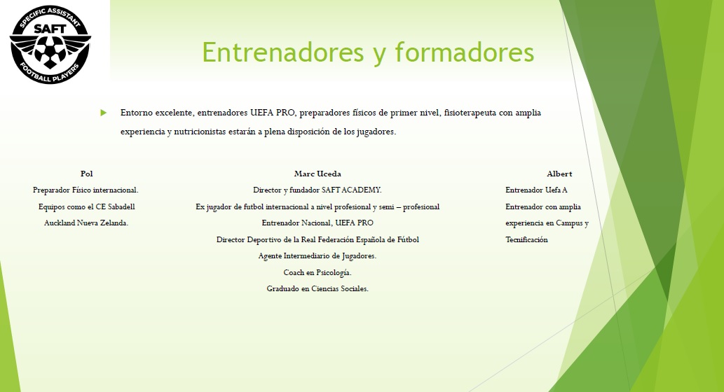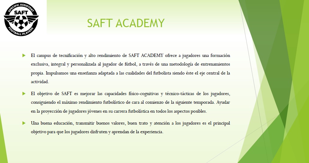 El objetivo de SAFT es mejorar las capacidades físico-cognitivas y técnico-tácticas de los jugadores, consiguiendo el máximo rendimiento futbolístico de cara al comienzo de la siguiente temporada. Ayudar en la proyección de jugadores jóvenes en su carrera futbolística en todos los aspectos posibles.