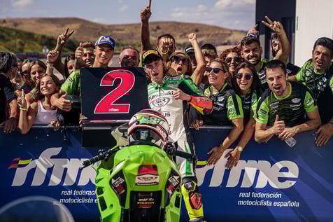 Desde la agencia deportiva JEP Sports Management, y la sección de la agencia de motociclismo JEP Sports, queremos destacar el carrerón de Adrián Rodríguez, del Team Speed Racing Lotus Cires, que lideró durante buena parte la carrera, quedando fuera del podio por muy poco pese a los méritos realizados para lograr victoria. Pese a dicha posición, el bueno de Adrián subió al cajón en la Copa Kawasaki que sin duda es un premio al esfuerzo. Hay que recordar que en la jornada del sábado se vio involucrado en un accidente múltiple cuando también iba en el grupo de cabeza, y este quinto puesto le sabe a poco en una prueba en la que rozó la victoria por momentos, y donde Adrián mereció mucho más. Aprovechamos para agradecer a Lotus, su principal patrocinador, así como Cires dental y el ayuntamiento de Tórtola de Henares, por su gran apoyo a nuestro joven piloto.