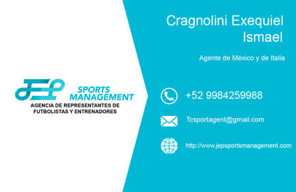 Exequiel Ismael Cragnolini, nacionalidad Argentina con más de 15 años ligado al deporte y marketing. Con experiencia, esfuerzo y dedicación para crecer junto a Jep Sports Management en países como México e Italia.