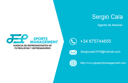 Sergio Cala es agente de fútbol asociado en Asturias de JEP Sports Management. Representante de futbolistas, con años de experiencia en el fútbol, coordinador, y con amplia experiencia y contactos con el fútbol en toda Asturias. Especialista en captar el mejor talento.