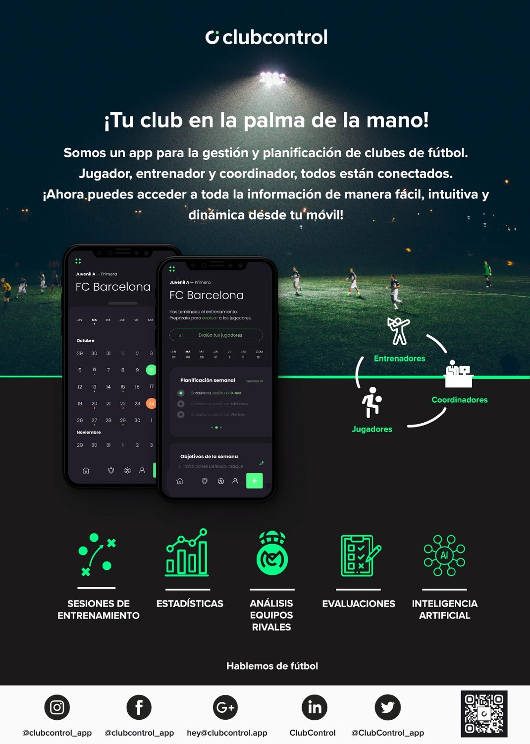 ClubControl, la plataforma para la gestión deportiva ideal para clubes de fútbol. Diseñada de forma dinámica, intuitiva y original. Una app para la gestión y planificación de clubes de fútbol. Jugador, entrenador y coordinador, todos están conectados y trabajando bajo unos mismos parámetros que se define en la dirección deportiva del club. Y todo desde tu móvil. Sesiones de entrenamiento, estadísticas, análisis de equipos rivales, evaluaciones, inteligencia artificial. La mejor plataforma.