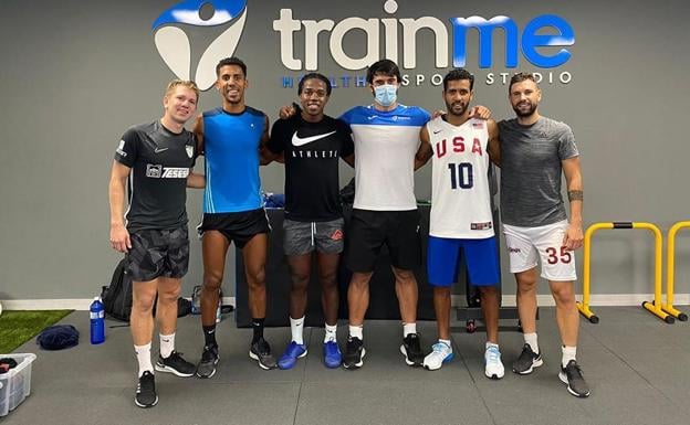 Los ex jugadores del Málaga CF, Fernando Tissone, promocionado por la agencia de fútbol JEP Sports Management, y Rolón, se entrenan juntos en Málaga, a la espera de encontrar un nuevo club. Ambos jugadores profesionales libres, como se puede ver en la foto, se encuentran trabajando a “full” y en grupo, como se puede ver en la foto: De izquierda a derecha, los jugadores Rolón, Cristian Tissone, Carlos 'La Roca' Sánchez, Fernando Tissone y Nico Delmonte.