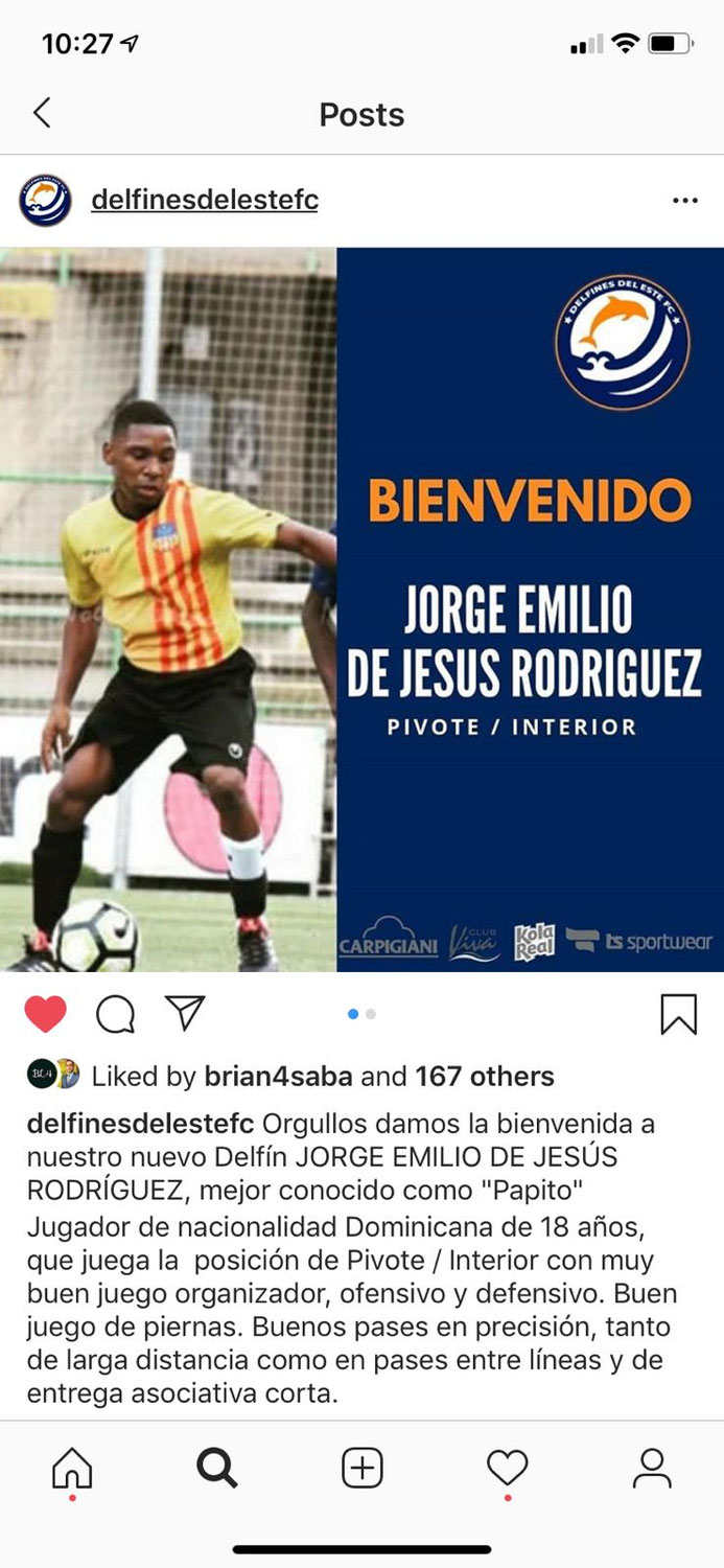 Jorge Emilio de Jesús Rodríguez, conocido como "Papito", jugador de JEP Sports Management, ficha en 1a división de República Dominicana por los Delfines CF . Queremos felicitar a Papito por su fichaje, a su agente Jordi Capel de JEP Sports y agradecer a Delfines CF la confianza en nuestra agencia.