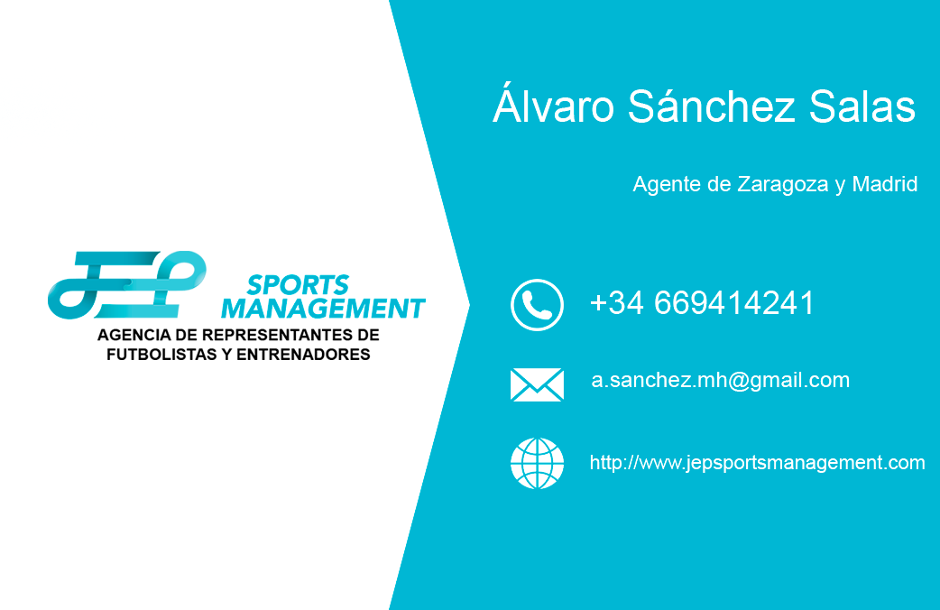 Álvaro Sánchez Salas se incorpora a JEP Sports como agente asociado. Álvaro Sánchez Salas, agente de fútbol asociado a JEP Sports Management. Gestiona la zona de Zaragoza y Madrid. Álvaro es licenciado en ADE, trabaja de asesor financiero, ha jugado en las categorías inferiores del Rayo Vallecano, y en equipos como Adarve, las Rozas, Fortuna, Canillas, Ateltico de Pinto, Vicalvaro y los Yebenes.