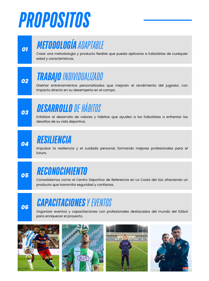 Un centro de élite en la Costa del Sol diseñado por futbolistas para futbolistas. Con metodologías personalizadas, instalaciones de primer nivel y un enfoque integral en el desarrollo físico, técnico, táctico y mental del jugador, PFC Proplayers es el espacio ideal para quienes buscan dar el salto de calidad.