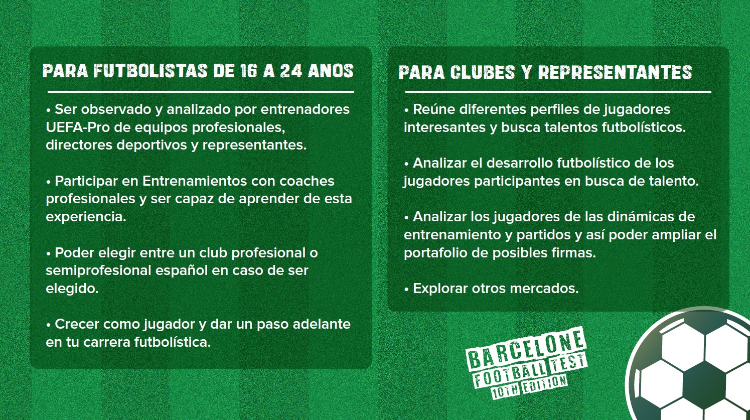 Participa en las pruebas de fútbol en Barcelona de la agencia de fútbol JEP Sports Management, Footboleros y Saft Academy. Logra tu sueño de ser visto por clubes, representantes y scouts y disfruta de una semana en diciembre 2023, del 17 al 21, de entrenos, sesiones y partidos organizados para que puedas mostrar tu talento y vivir una experiencia única. Plazas limitadas. Apúntate ya!!