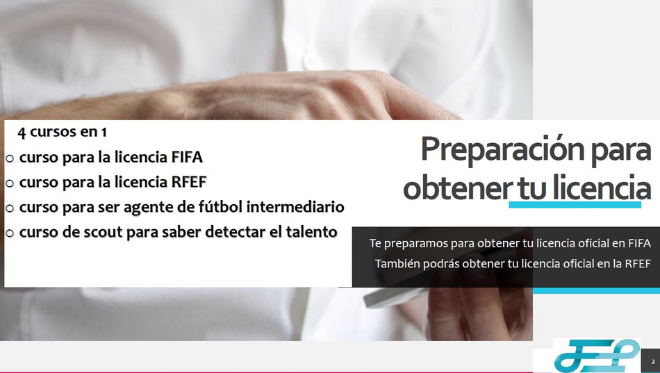Accede al primer curso de agente fifa con prácticas reales en una agencia de fútbol. Ya tienes la ocasión de estudiar para ser agente de fútbol y practicar la profesión con la agencia de fútbol JEP Sports Management. El primer curso para ser representante de jugadores de fútbol donde te muestra las entrañas de esta profesión. Y además, si quieres, podrás trabajar desde el minuto cero de la mano de una agencia bien posicionada en el mercado para que se te puedan abrir puertas que yendo por libre son muy complicadas de acceder.