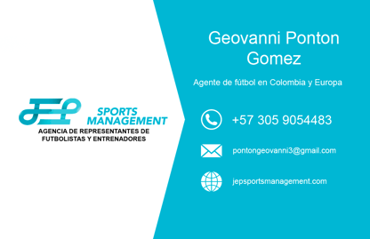 Geovanni Ponton Gomez, es un agente de fútbol en JEP Sports Management en Colombia y Europa. Confianza, honestidad, paciencia, cercanía y empatía son los principales valores de este agente. Con contactos más que suficientes para un buen asesoramiento futbolístico y laboral.