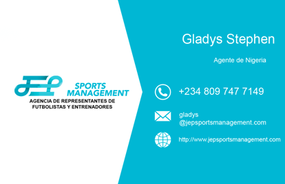Gladys Stephen es agente de fútbol de JEP Sports Management en la zona de Nigeria, experta en negocios, con contactos e influencia, trato personal, afable, discreto y serio.
