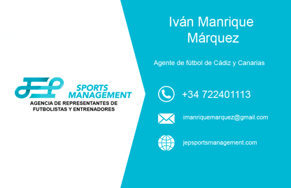 Iván Manrique Márquez agente de fútbol Jep Sports Management, perteneciente a la zona de Cádiz y Canarias. Confianza, honestidad, paciencia, cercanía y empatía son los principales valores de este agente. Le gusta trabajar también el mercado africano y el fútbol femenino.